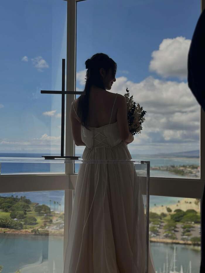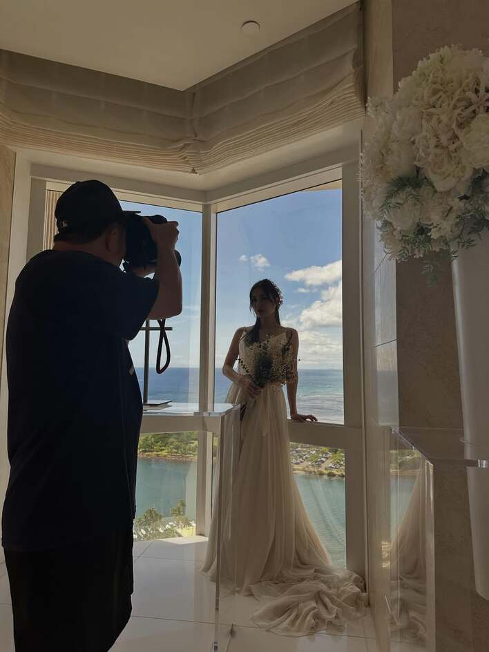 また、ウェディングドレスを着たバックショットも公開していて、遠目の写真からでも分かる、鍛え上げられた美背中に思わず見入ってしまいます。