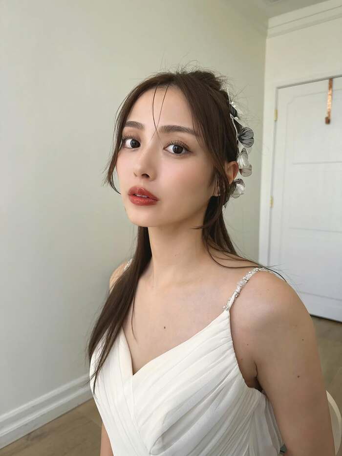 白のドレスでたたずむ姿は、優美な雰囲気があふれています。