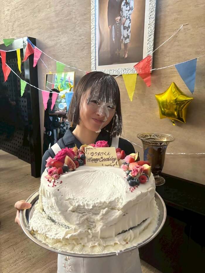そして、大友さんの持つケーキには、思いきり顔を突っ込んだことがうかがえる頭の形の痕跡が!“顔面ケーキ”の衝撃の強さが感じられますね。