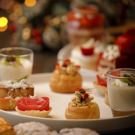 スイーツ香ばしいアーモンド風味の生地に、コクのあるバタークリームを混ぜ込んだスポンジに、いちごを合わせた「フレジエ」や、ライチとローズが華やかに香る4層仕立ての「ストロベリーパフェ」、アクセントには、カカオのサブレにチョコレートのガナッシュで仕上げた「ヘーゼルナッツチョコレートタルト」をご用意。可憐な見た目に大人の風味が重なるフェスティブシーズンを彩るスイーツをご堪能いただけます。