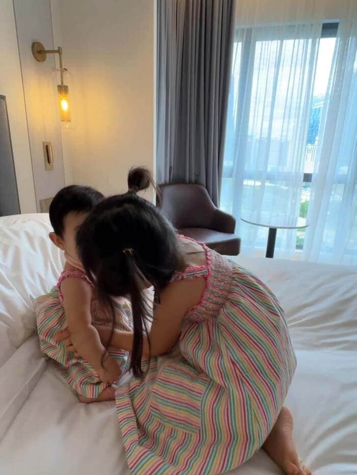また、ホテルのベッドに座る、パステルカラーのボーダー柄のおそろいファッションを着こなす娘たちのショットや…。