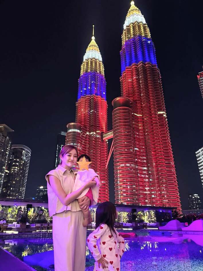 そこには、黄色・青色・赤色と上から下までライトアップされたツインタワーをバックに、ほほ笑みながら次女を抱っこする菊地さんの姿が。となりにはハートがちりばめられた服を着た長女が、腰に手をついて後ろを向いていて、SNS映えする1枚です。