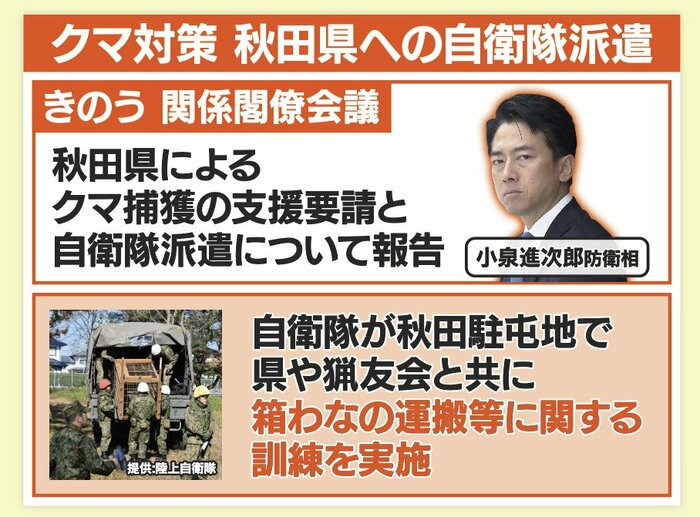30日に行われた関係閣僚会議で小泉防衛相は、秋田県が要望したクマの捕獲支援に関する自衛隊の派遣について報告。自衛隊が秋田駐屯地で県や猟友会とともに箱わなに関する訓練を実施したことを明らかにしました。