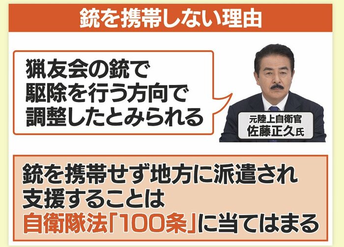 今回、自衛隊は銃を携帯しないということですが、この理由について佐藤氏は「猟友会の銃で駆除を行う方向で調整したとみられる。銃を携帯せずに地方に派遣され支援することは自衛隊法『100条』に当てはまる」といいます。