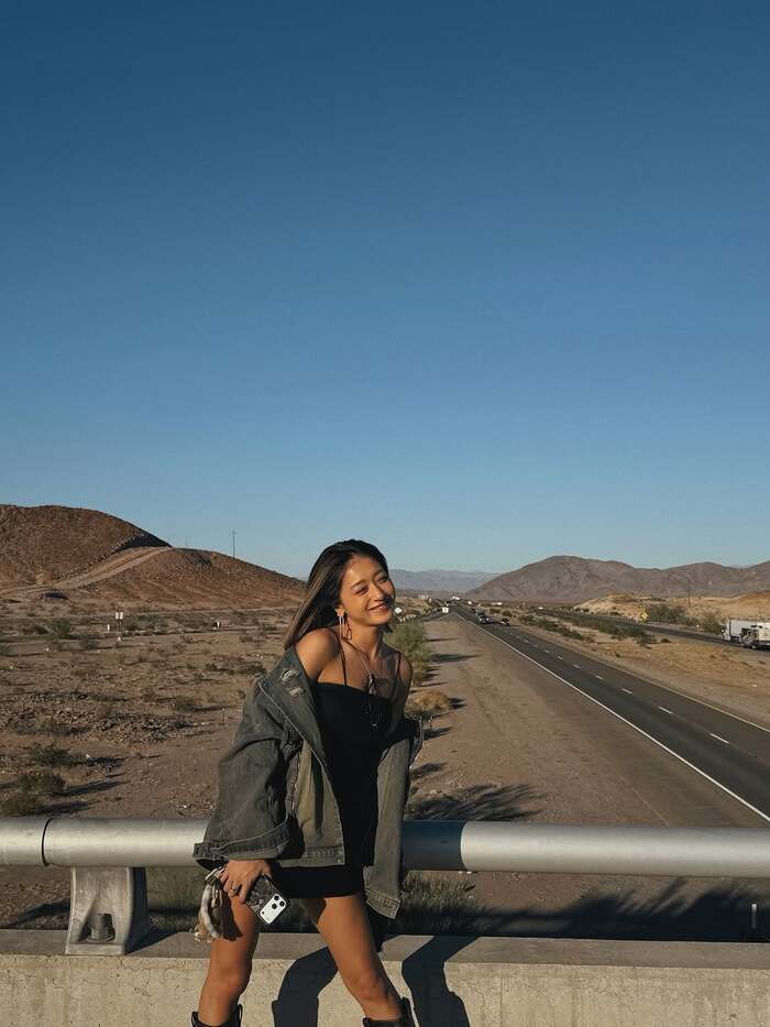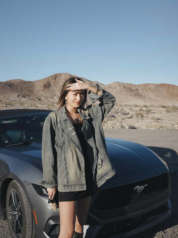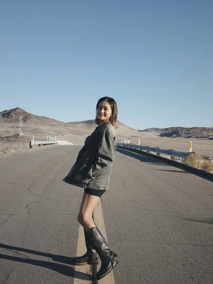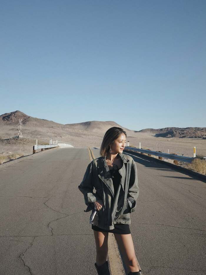海外と思われる広大な荒野をバックに黒のミニ丈のスカートにオーバーサイズのデニム生地のアウターを羽織った姿が!