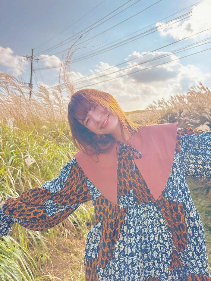 両手を大きく広げて秋風を感じているようなショットでは、首をかしげて穏やかにほほ笑んでいます。