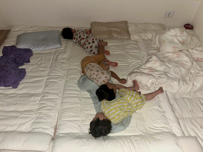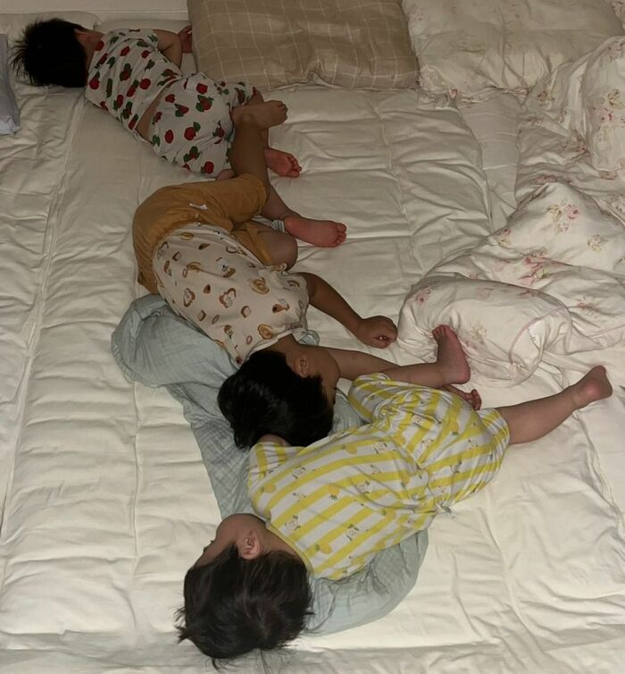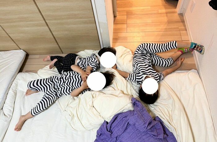 それぞれの布団で3兄弟の寝かしつけをし、家事を終えて寝室に戻ると、写真のような状況だったといい「母の布団に集まるのは我が家だけなのか?」と疑問に思い、投稿したということです。