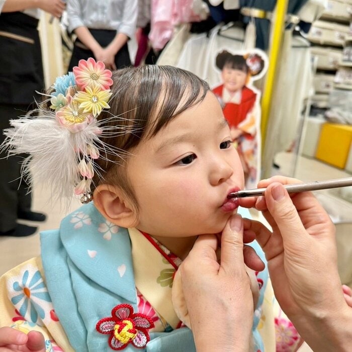 淡い黄色に花柄がデザインされた着物を身にまとった妹のひーちゃんは、「うー」と唇を突き出し、メイクアップの真っ最中。まるでお人形さんかのような おちゃめフェイスで、とっても愛らしいです。