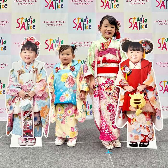 さらに、2人の両サイドにある、妹のひーちゃんにそっくりな着物姿のパネルが目に飛び込んできます。このパネルについて、投稿文では、「3歳だった時のののちゃんと」と、姉・ののちゃんが3歳の時に撮影した七五三ショットということを明かしました。