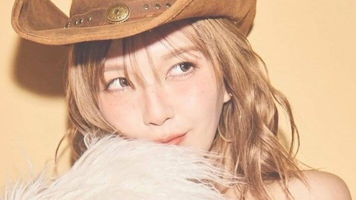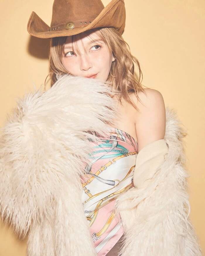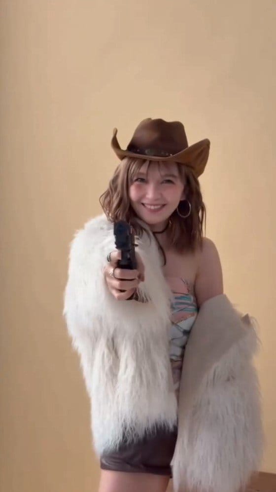 写真には、ブラウンのウエスタンハットをかぶり、ピストルを持ってはじける笑顔を浮かべる宇野さんの姿が収められています。スカーフ風のベアトップスを合わせたショート丈コーデになっていて、ロングブーツをはいています。