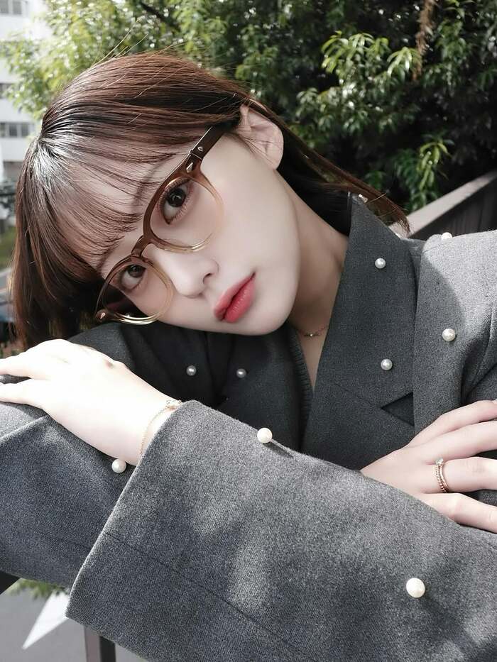 茶色がかったフレームのメガネをかけた田中さんは、上目遣いでこちらを見つめています。ちょこんと傾けた首と、腕を組んだスタイルが大人の女性を演出。さらに、真っ白な肌に際立つ赤リップもなんとも印象的です。