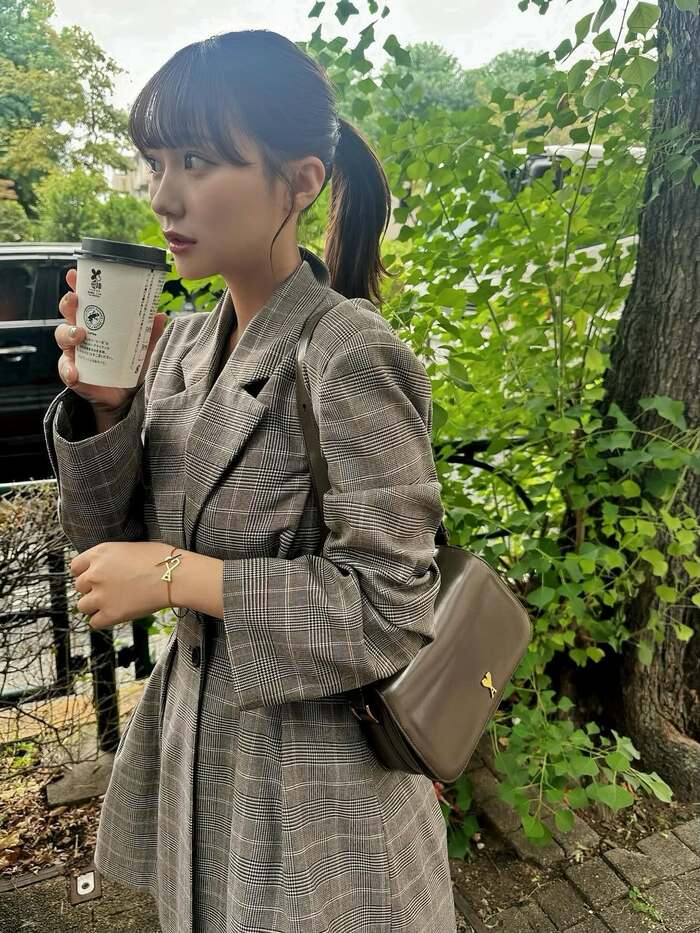 写真には、秋らしいチェックのジャケットを羽織ったコーディネートでコーヒーを楽しむ姿や…