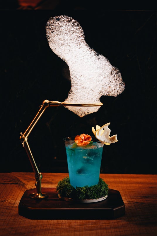 鮮やかな青の一杯に、ふわりと漂うコーヒークラウド。蝶が舞い立つ瞬間を思わせる幻想的なカクテルです。バタフライピーを用い、日本の国蝶オオムラサキの色彩をイメージ。トップにはコーヒーフレーバーのエディブルクラウドを浮かべ、蝶が舞い上がる空や雲を表現。“バタフライエフェクト=小さな変化が大きな結果を生む”という思想を文明開化や侍の旅立ちに重ね、視覚的にも物語的にも印象に残る一杯に仕上げました。2800円(税込)