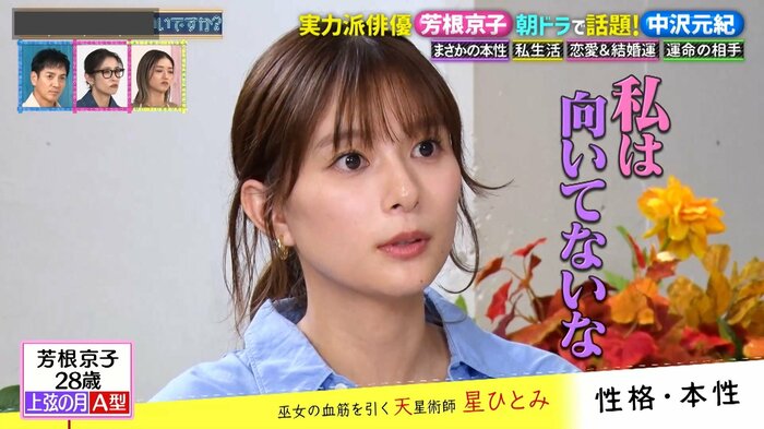星さんが「ストレスで胃腸炎になる」と占うと、芳根さんは図星のようで驚きの声を上げ、「朝ドラのクランクインも、放送が始まる直前も、胃腸炎でした」と告白。