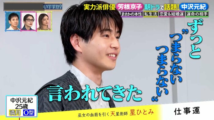 中沢さんには、「女性によって運命が変わる」という鑑定も。星さんは「恋愛より結婚向きで、付き合うと安心させてくれるし、刺激もない」と占い、「異性に染められやすいから、キツい人、口が悪い人、指摘する人と付き合っちゃダメ」と忠告しました。