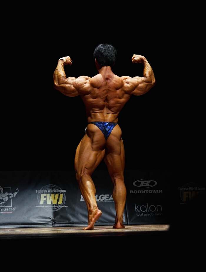別のカットでは、スポットライトを浴びたまま後ろを向き、これでもかというほど背中の筋肉を観客に見せつけています。写真にもかかわらず、ついつい圧倒されてしまう1枚です。