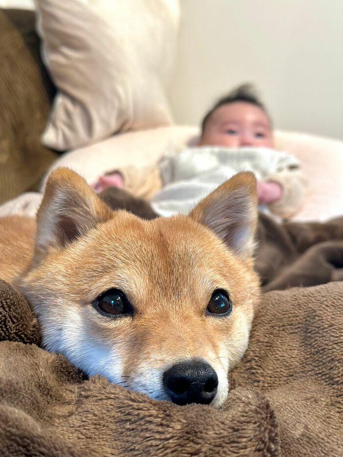 そして、最近生まれた赤ちゃんを見守るかのように側で毛布の上に顔を乗せる姿も。でも、飼い主が赤ちゃんを構っていると嫉妬してしまう時もあるんだとか。