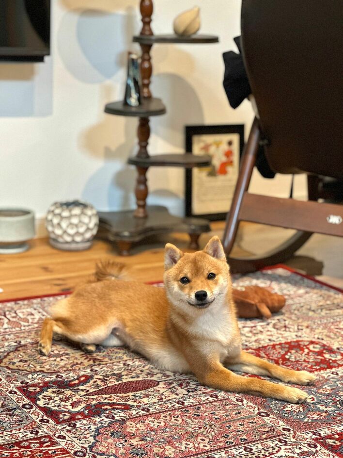 絨毯の上で、ふせをしながらこちらを見つめる豆柴のタマちゃんは、2歳5カ月の女の子。