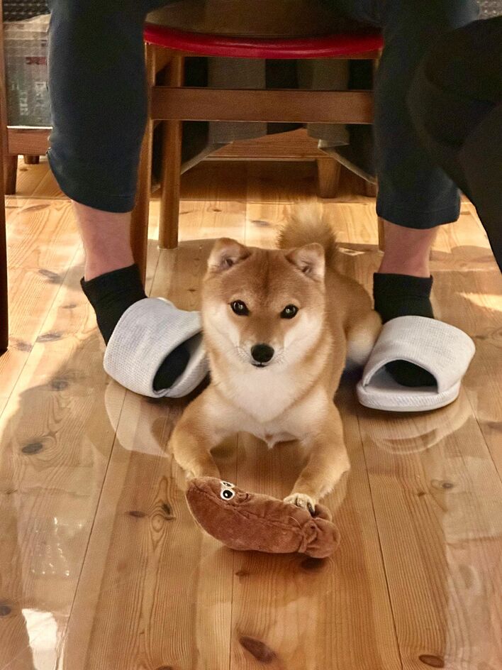 お家では、イスに座る飼い主の足元にちょこんと、ふせをするタマちゃんの姿が。一緒に遊んでほしいのでしょうか…愛用のおもちゃも一緒です。