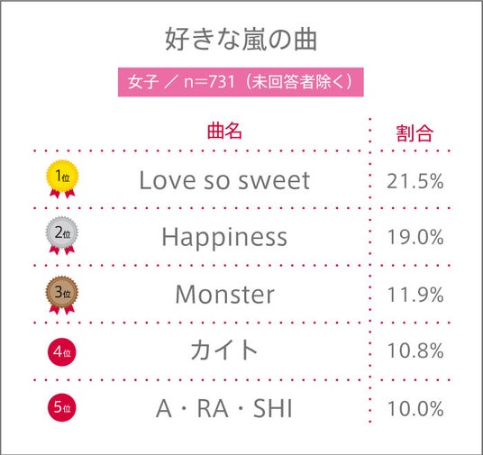 1999年リリースの『A・RA・SHI』をはじめ、2007年にリリースされた『Happiness』、『Love so sweet』など、現在の高校生が生まれる前や、幼い頃にリリースされた楽曲が多くランクインする結果となりました。