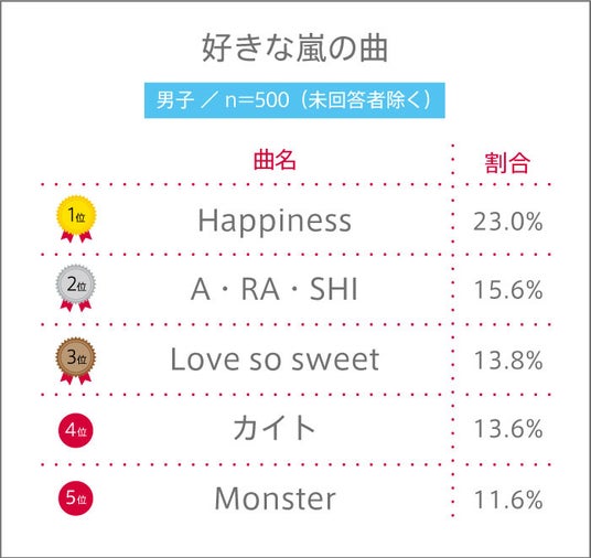 男子の5位で女子の3位には、大野智主演のドラマ『怪物くん』の主題歌『Monster』がランクインし、上位5つにランクインしたものは、男女で違いは見られませんでした。