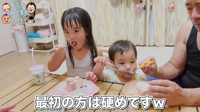 このアイスクリームケーキは、チョコレートやキャラメルなど6種類のフレーバーが一度に楽しめるそうで、2人は表面の硬い部分に苦戦しながらも、スプーンを持つ手が止まらない様子を見せています。