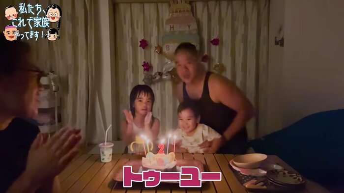 ごはんの後には、部屋の照明を落とし、数字の「2」のろうそくがのった誕生日ケーキが登場!ろうそくに火をつけて「Happy birthday to you」を家族で大合唱♪