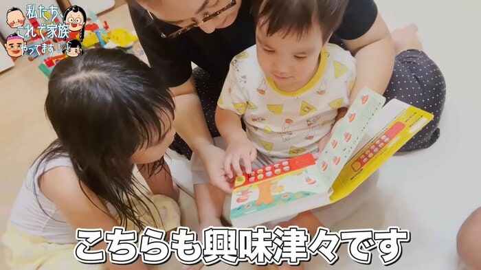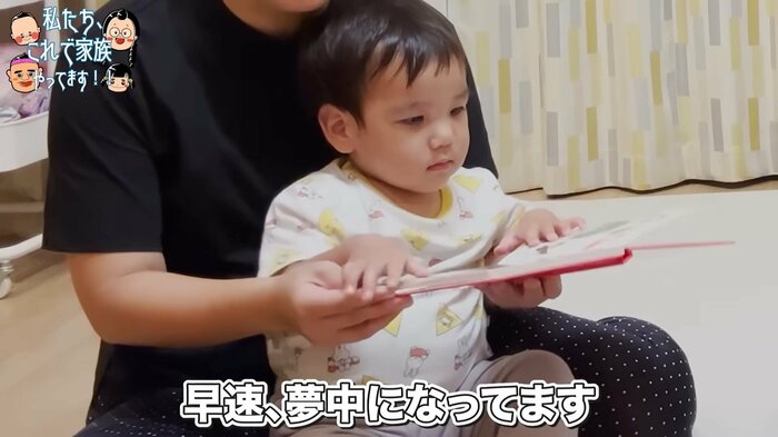 白鳥さんの膝の上に座った“チェリ坊くん”は、絵本を受け取ると、早速ページをペラペラとめくり、絵本にくぎ付けな様子です。