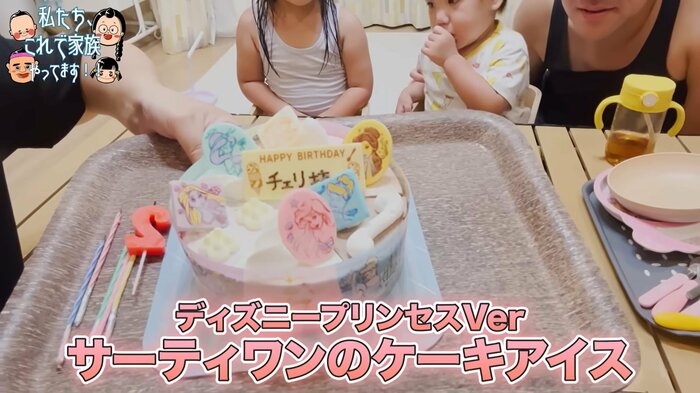 誕生日ケーキは、ディズニープリンセスが好きな“チェリ坊くん”に合わせた、ディズニープリンセス仕様のアイスクリームケーキ。