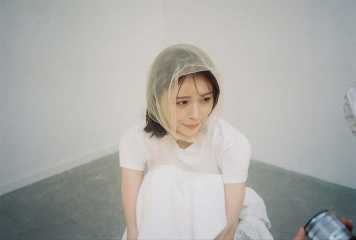 長濱さんは、寝そべりながらも、両手で持ったカメラを自身に向けシャッターを切っている様子。周りには、現像された写真がたくさん散りばめられています。