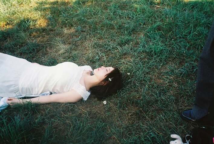 写真には、真っ白なワンピースに身を包み、野原の上で眠る長濱さんの姿が。