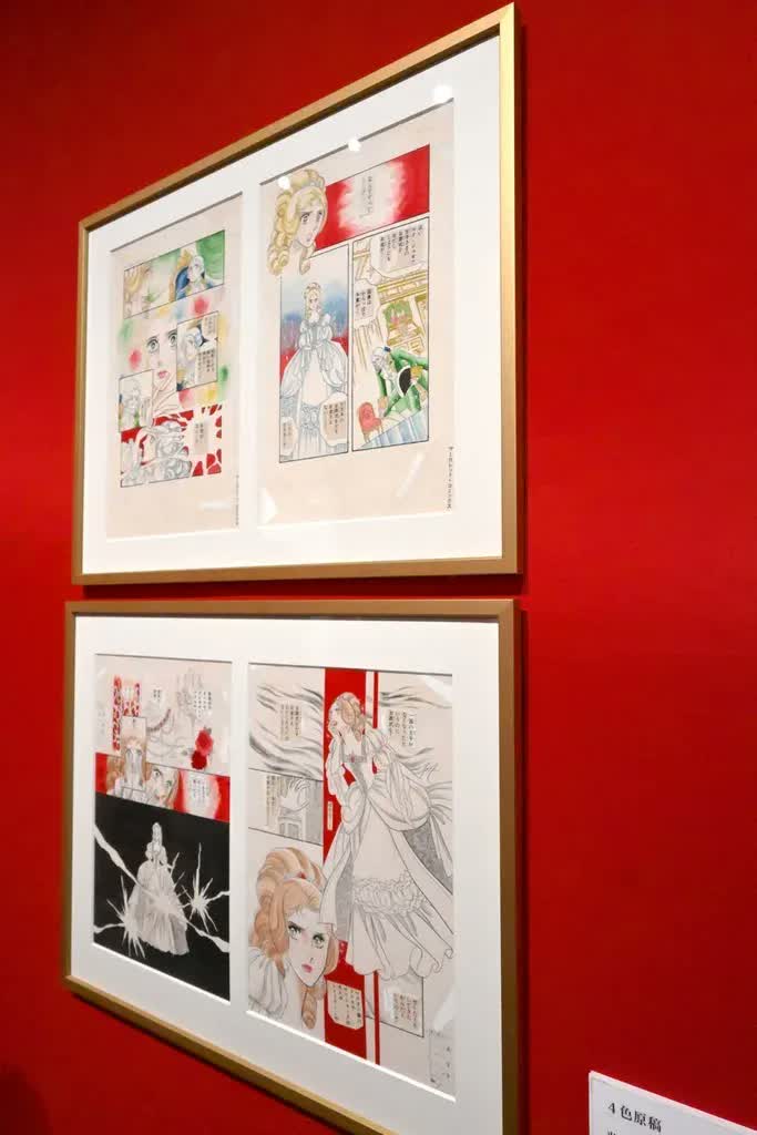 主にマリー・アントワネットとオスカルに焦点を当てて厳選された貴重な原画、約180点がストーリーに沿って展示されています。50年前(!)の色付けとは思えない美しい表紙のイラストから、連載ページをたどるように読めます。至近距離で閲覧でき、見ごたえ十分なので、ぜひじっくり見てほしいところ。