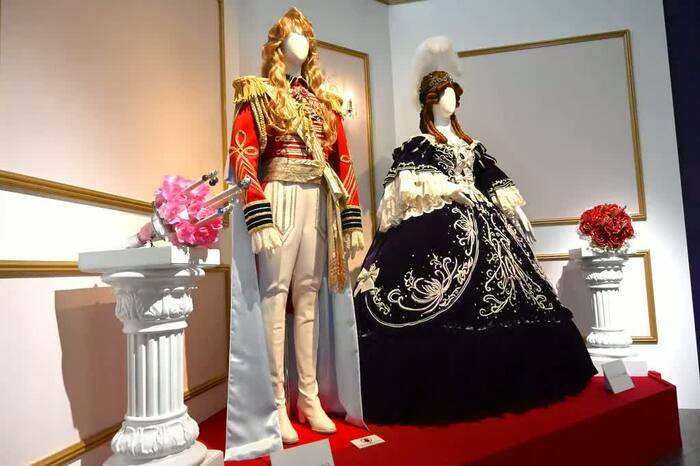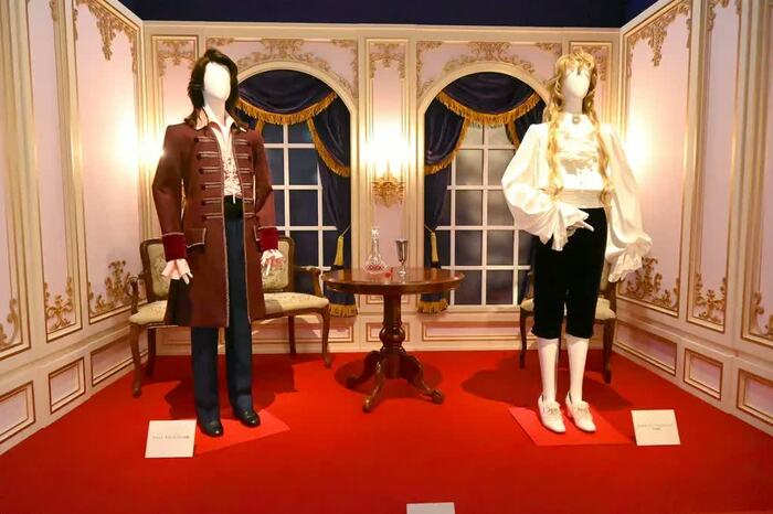 さらに、オスカルとマリー・アントワネットの舞台衣装や、小道具も展示。豪華絢爛なつくりに、うっとりします。公演のフィナーレで出演者が手に持つ小道具“シャンシャン”は、2種類展示されています。見比べてみるのも面白いです。