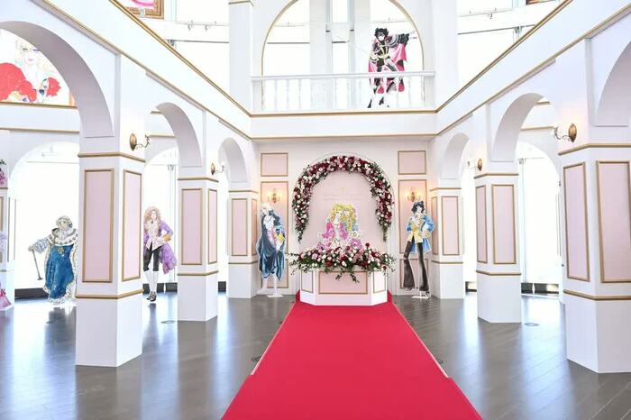 会場に入ると、ベルサイユ宮殿をイメージした美しい回廊が出迎えてくれて、気分は「ベルばら」の世界へワープしたかのよう。そして奥にはオスカル、マリー・アントワネット、フェルゼン、アンドレの4人のパネルが。等身大かと思えるようなリアルな佇まいで、マンガから抜け出してきたようです。
