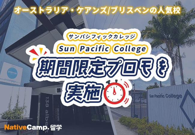 ネイティブスピーカーと回数無制限のオンライン英会話サービス「ネイティブキャンプ英会話」を展開する株式会社ネイティブキャンプ(東京都渋谷区 代表取締役: 谷川国洋)は、海外留学エージェントサービス「ネイティブキャンプ留学」において、オーストラリア・ケアンズ/ブリスベンの人気校「Sun Pacific College」期間限定プロモを実施いたします。