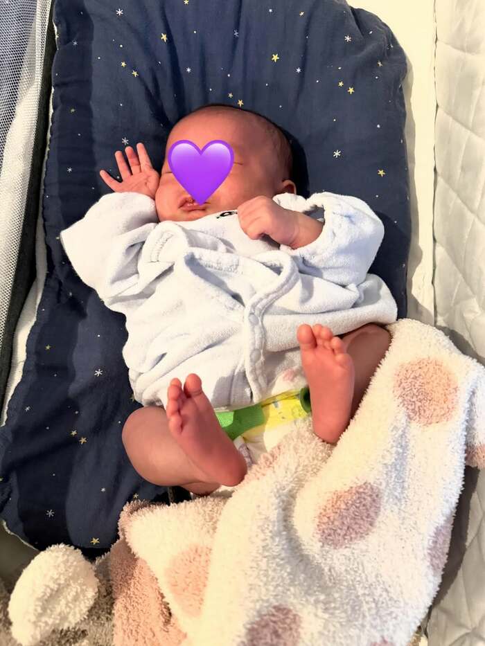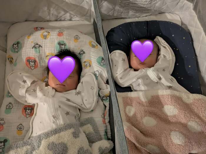 そこには、おそろいの星模様のスワドルに包まれた双子の姿が。ふたりともバンザイをしながら、スヤスヤと気持ち良さそうに眠っています。