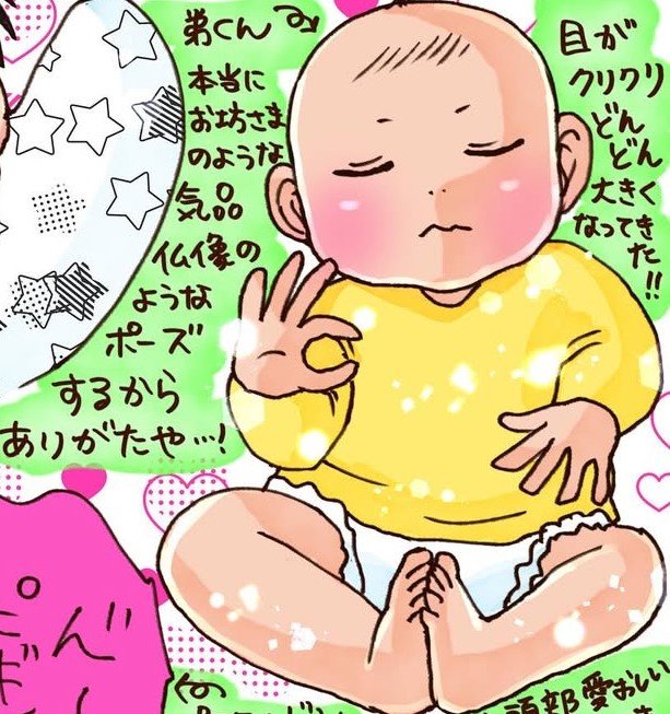次男について、「弟くん 本当にお坊さまのような気品 仏像のようなポーズするからありがたや…!」と、かわいらしい絵日記でつづった中川さん。