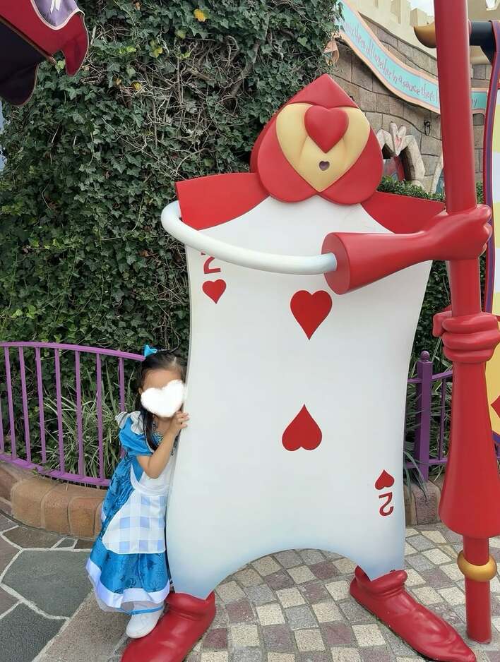 投稿された写真を見てみると、ディズニーランド内にあるレストラン『クイーン・オブ・ハートのバンケットホール』の入り口にあるトランプ兵と親子ぴったり並んでパシャリ。