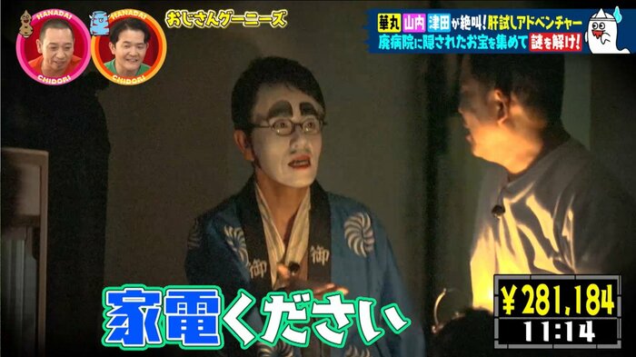 ヒント③は、トイレにいた患者の幽霊からGET。よく見ると、それは白塗りキャラ“白物屋家電ノ助”に扮した市川(女と男)さんでした。