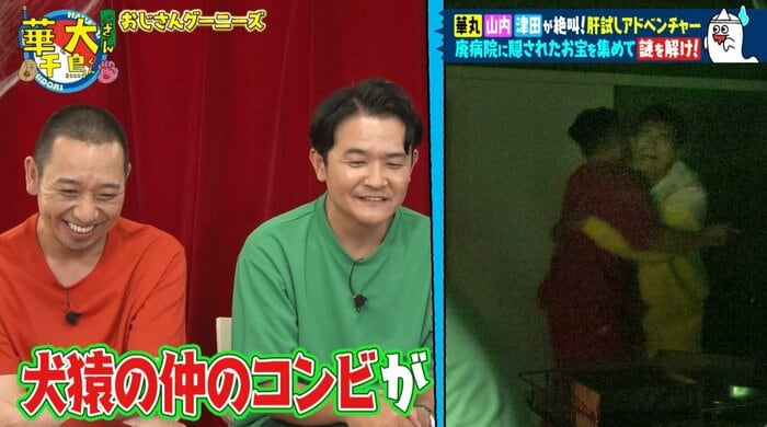 津田さんは腰を痛めて悶絶&華丸さんは腰を抜かし「無理ば~い」と絶叫。さらに、突如現れたおばけに驚いた勢いで、この番組では“犬猿の仲”である、山内さんと華丸さんが思わず抱き合う奇跡のハプニングも!