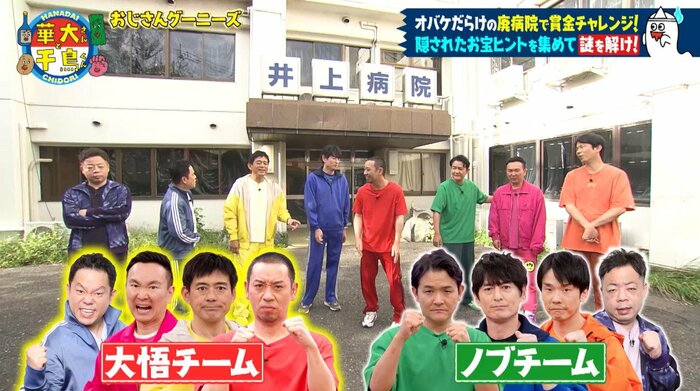 大悟さん率いる「大悟チーム」(華丸さん、山内さん、津田さん)と、ノブさん率いる「ノブチーム」(大吉さん、濱家さん、ユースケさん)がタイムトライアル形式で対決。千鳥は、リーダーとしてモニタリングに徹し、探索には参加しません。