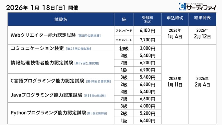 株式会社サーティファイ(本社:東京都中央区、代表取締役:瀧澤茂、以下「サーティファイ」)は、2026年1月18日(日)に開催する「Webクリエイター能力認定試験」「コミュニケーション検定」「情報処理技術者能力認定試験」「C言語プログラミング能力認定試験」「Javaプログラミング能力認定試験」「Pythonプログラミング能力認定試験」の公開試験の申込受付を2025年11月4日より開始しました。
