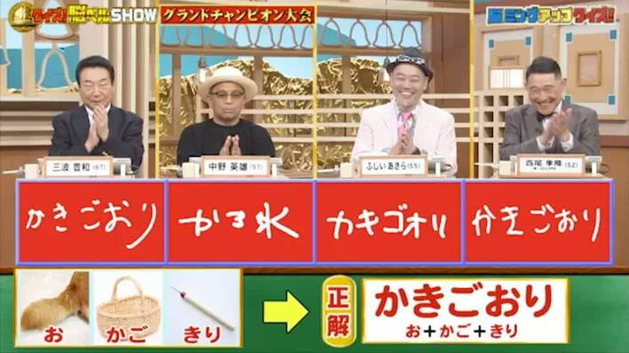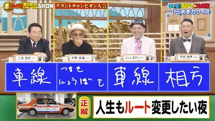 今回の解答者は、俳優の三波豊和さん(67)、俳優の中野英雄さん(57)、マジシャンのふじいあきらさん(55)、お笑いコンビ「X-GUN」の西尾季隆さん(52)の4名です。