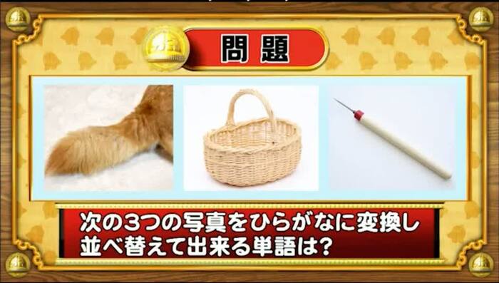 最初は「脳ミングアップクイズ」から、シャッフル写真の問題。次の3つの写真をひらがなに変換し、並べ替えて出来る単語は何でしょうか?