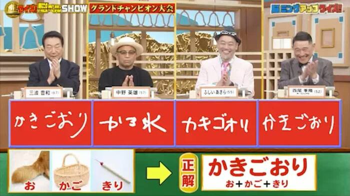 正解は「かきごおり(お+かご+きり)」。全員正解。