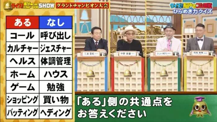 次は、あるなしクイズ。次の単語の「ある」側の共通点を答えてください。