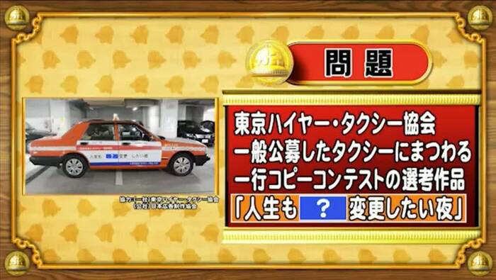 最後は、「タクシーの日(8月5日)」問題。東京ハイヤー・タクシー協会が一般公募した、タクシーにまつわる一行コビーコンテストの選考作品「人生も[?]変更したい夜」。「?」に入る言葉は何でしょう?
