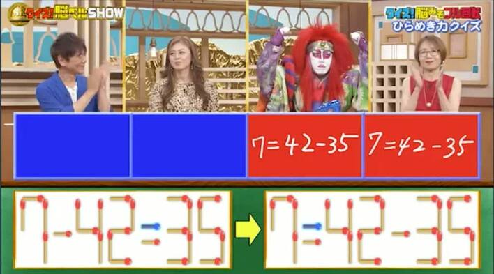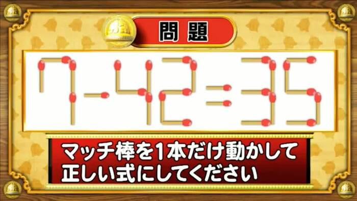 正解は、「=」から1本動かし「-」にします。その1本を前にある「-」に足して「=」にします。そうすれば「7=42-35」となります。氏神さんと奈美さんが正解!