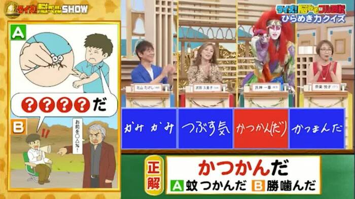 正解は「かつかんだ(蚊、つかんだ/勝、噛んだ)」。氏神さん1人が見事正解。