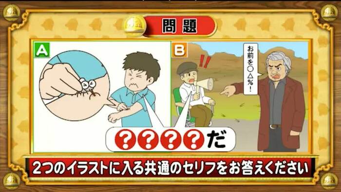 次は、共通セリフ問題。次の2つのイラストに入る共通のセリフを答えてください。